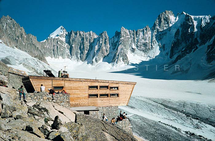 Il rifugio con la testata del ghiacciaio. Sullo sfondo da sinistra le Aiguilles Rouges du Dolent, il Mont Dolent, L'aiguille de Triolet.